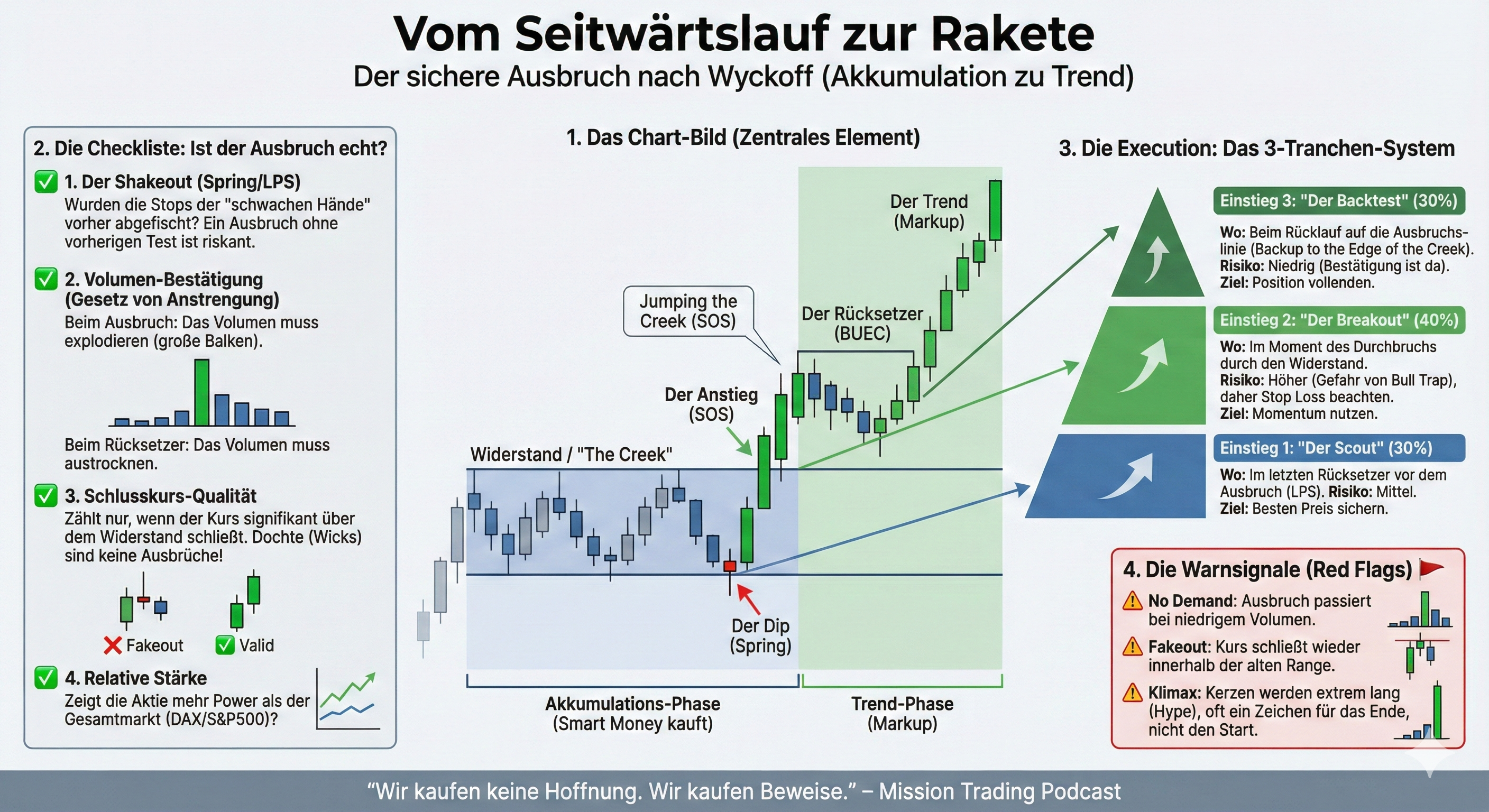Ein echter Ausbruch aus einer Seitwärtsphase kann eine der profitabelsten Situationen an der Börse sein. Gleichzeitig ist es eine der gefährlichsten: Du kennst das sicher – die Aktie springt nach oben, du steigst ein und wirst Sekunden später mit einem Stop-Loss rausgekickt, weil es sich nur um eine Bullenfalle gehandelt hat. Du kannst Ausfälle reduzieren, wenn du den Ausbruch wie ein Prozess betrachtest und nicht wie einen Zufall. Ich zeige dir eine einfache, praktikable Struktur, mit der du die Wahrscheinlichkeit eines echten Wyckoff-Ausbruchs deutlich erhöhst und Trades professionell managst.